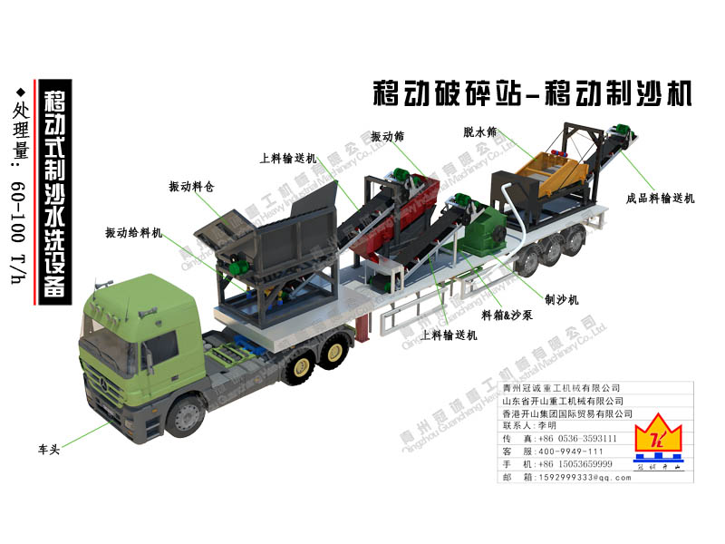 本套移動破碎站為移動式制沙水洗設(shè)備,處理量為每小時60-100噸,本移動破碎站是青州冠誠重工機械有限公司獨立設(shè)計制作而成,直接采用17.5米半掛車底盤改裝制作,基優(yōu)勢如下:
