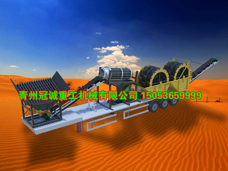 本套移動破碎站為移動式制沙水洗設備,處理量為每小時100-120立方(150-180噸)。可以使用半掛車頭或者挖掘機、裝載機等牽引車輛輕松移動到工作場地。